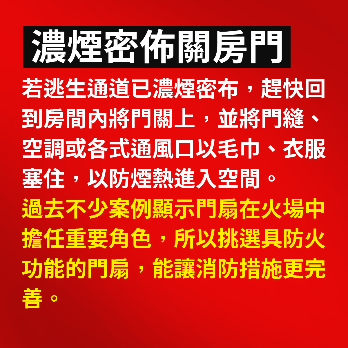 ▍「小火快逃,大火關門」剛起火趕緊逃生,若火勢已大到無法逃出,則躲回原樓層房間