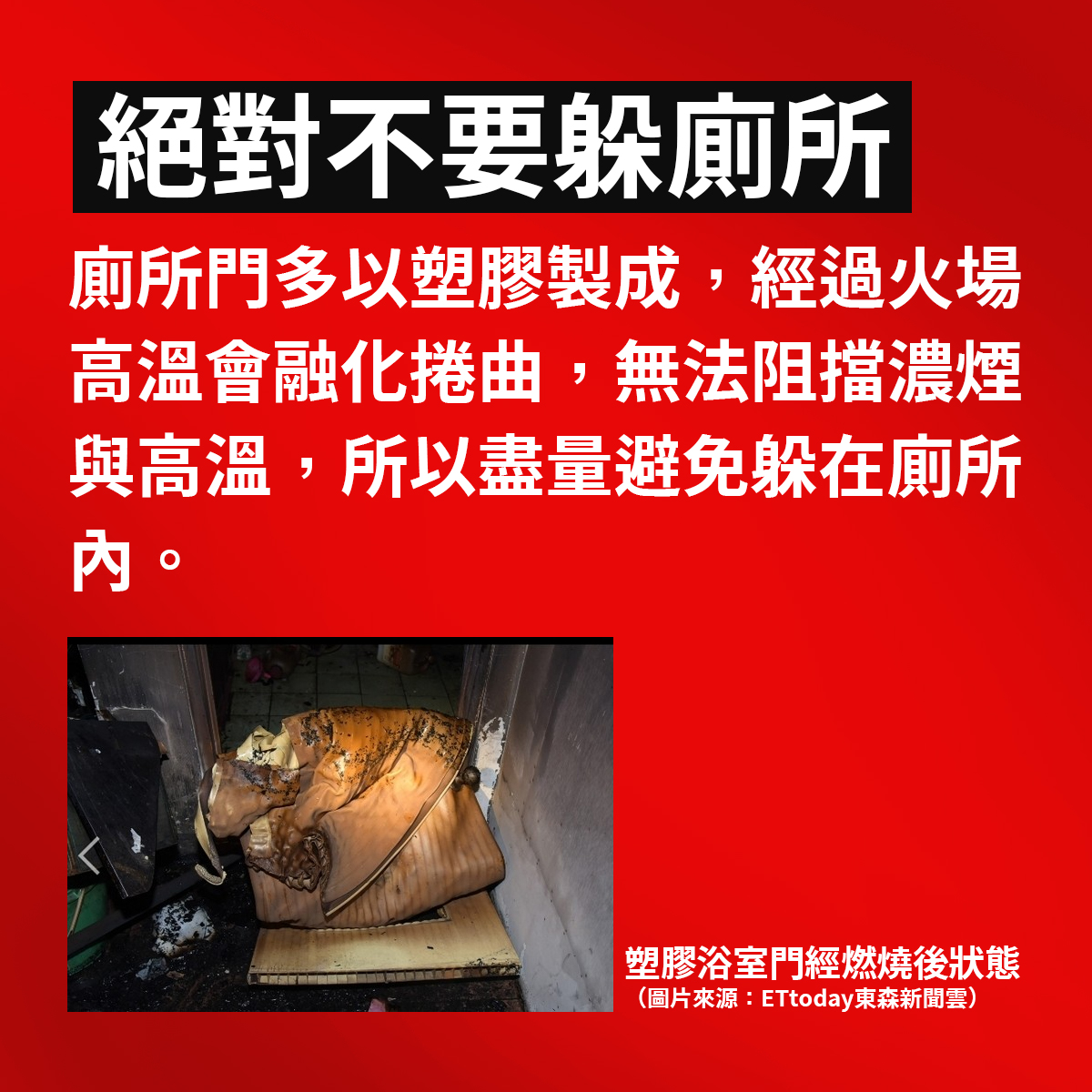 ▍絕對不要躲廁所,因為大部分的廁所都是塑膠門,在高溫下塑膠門會融化,造成煙熱進入