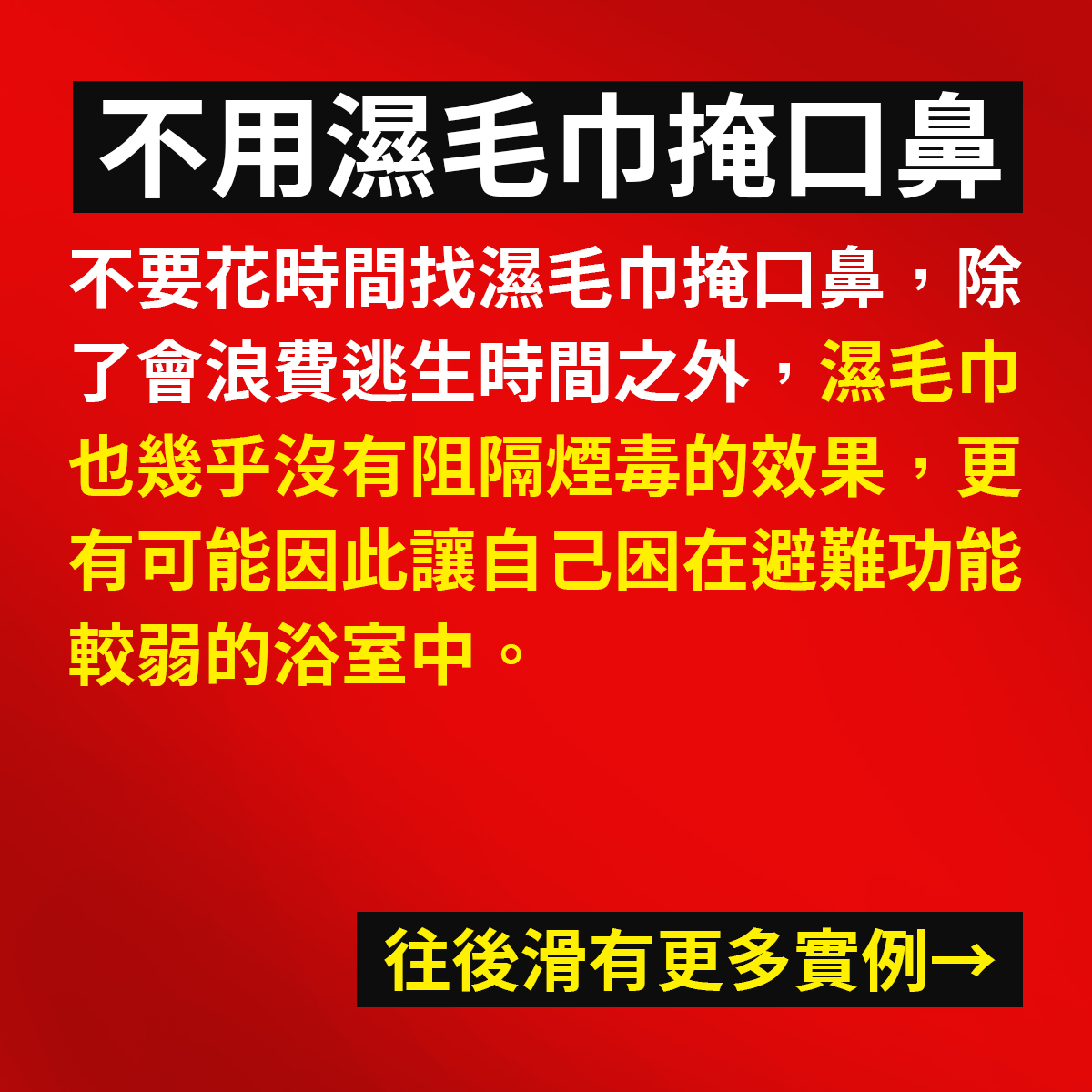 ▍不要花時間找濕毛巾濕掩口鼻,除了會浪費逃生時間之外,濕毛巾也沒有阻隔煙毒的效果