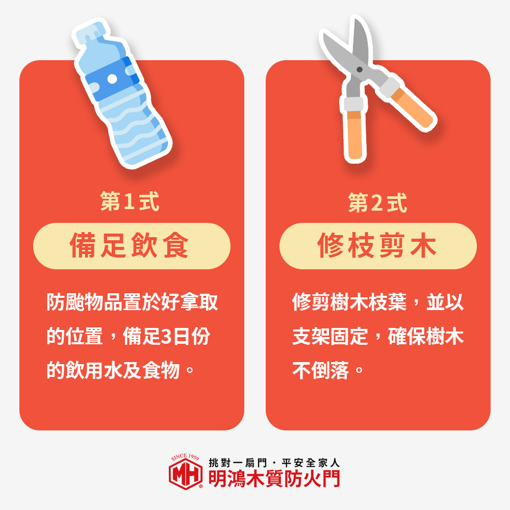 ◎除了足夠的食物和飲水外,也可準備電池、行動充電器、蠟燭、手電筒、收音機、簡易醫療急救包...等;此外也應備好儲水,以防臨時停水。