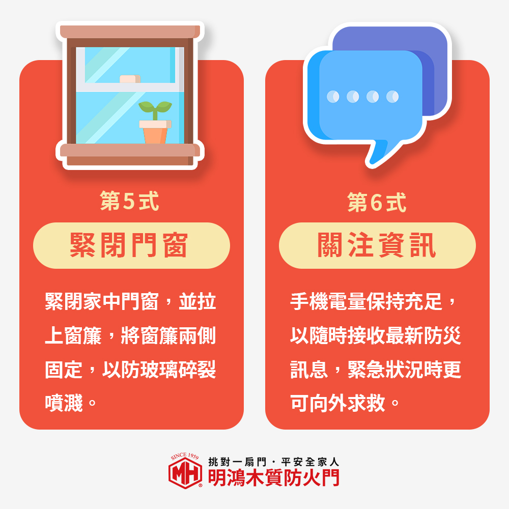 ◎常見大眾以膠帶貼窗以防玻璃碎裂,根據消防署解釋,膠帶宜以米字型的貼法增加玻璃中心支撐力,且最好貼到窗框之外。但是膠帶強化作用有限,最好還是將窗簾固定好,才在第一時間阻擋飛濺的玻璃碎片。