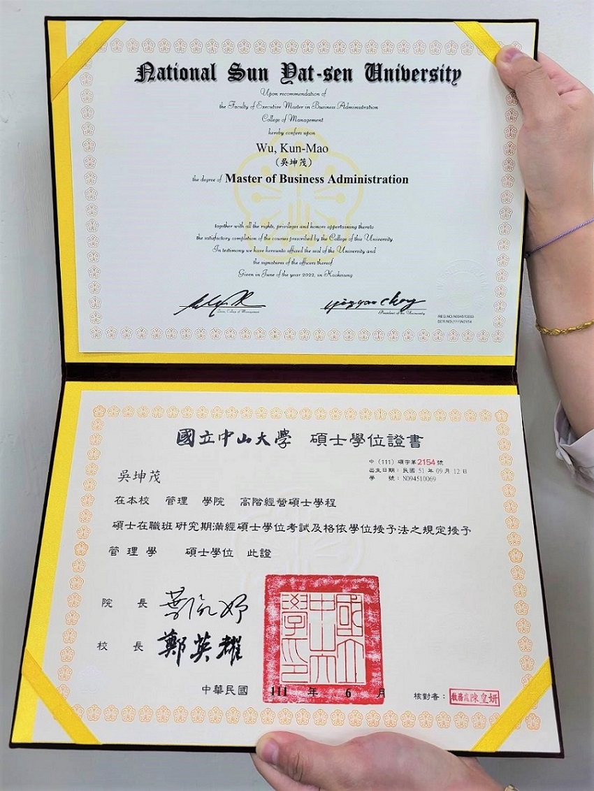 【最新消息】賀!吳坤茂董事長取得國立中山大學 高階經營碩士學位