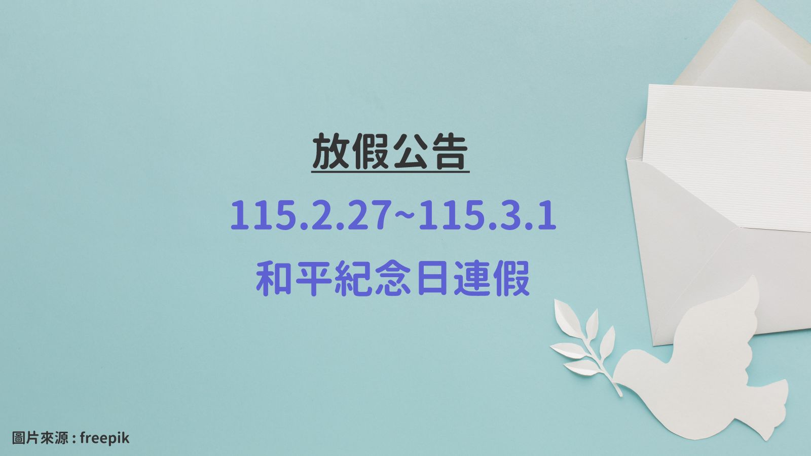 【放假公告】2026/02/27~03/01 和平紀念日休假公告